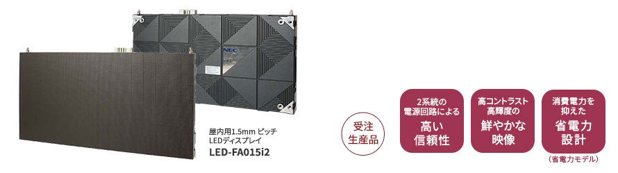 フルHD解像度を構成しやすいアスペクト比16:9のLEDモジュールと近距離からの高い視認性を確保した、細かな画素ピッチを採用。屋内のさまざまな空間で大画面ニーズに応えるフルカラーファインピッチLEDディスプレイ。映像・電源回路に2系統の冗長性を持ち、画面表示の消すことのできない用途において高信頼性を確保することが可能です。