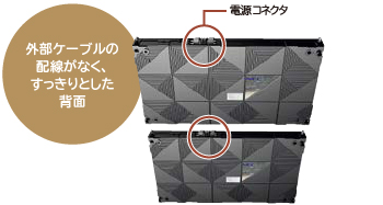 LEDモジュールの上下に電源供給のコネクタを装備しており、モジュールの組み合わせコネクタを接続するだけで電源配線が完了。また映像信号は、キャビネットのホール部分からLANケーブルを通して結線します。このため背面での配線が不要になり、モジュール間の配線が外部から見えないのでスマートな設置が可能です。