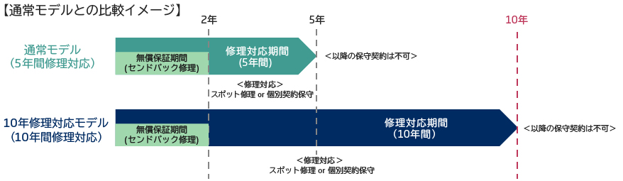 通常モデルの修理期間は5年で、引き渡し後、2年間の無償保証期間を含む5年間の修理対応が可能です。しかしさらに長期の運用を希望される方へ、10年間修理対応が可能となるようスペアパーツを手配、保有する「10年修理対応モデル」をラインアップしました。本モデルをご購入いただくことで、長期間にわたる継続的な運用が可能です。