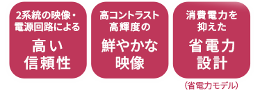 明るい環境下でもくっきり鮮やかな高画質設計。映像・電源回路に2系統の冗長性を持たせ、画面表示を消すことのできない用途にも高い信頼性を確保したハイグレードモデル。