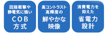 表面全体が樹脂で保護されており、外部からの衝撃や静電気などへの耐性が向上。人が触れることが想定される場所にも設置できる、高耐性・高画質・省電力設計のCOBフリップチップ方式モデル。