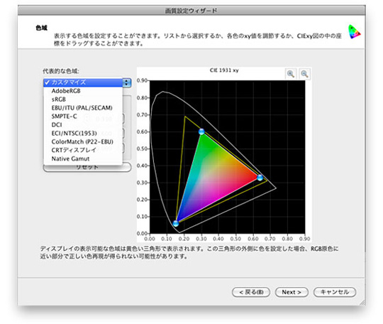sRGBなどよく使われる色域はプルダウンから選択するだけで設定できます。微調節を行う場合は、青いハンドルを動かします。目標となる値が分かる場合は数値入力もできます。