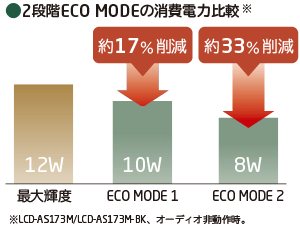 画面の輝度を通常使用で支障のないレベルまで落とすことで、消費電力を削減するECO MODEを搭載。ECO MODE1(初期設定:約200cd/㎡)、ECO MODE2(約100cd/㎡)の2段階の設定を用意しています。