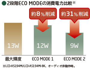 画面の輝度を通常使用で支障のないレベルまで落とすことで、消費電力を削減するECO MODEを搭載。ECO MODE1(初期設定:約200cd/㎡)、ECO MODE2(約100cd/㎡)の2段階の設定を用意しています。