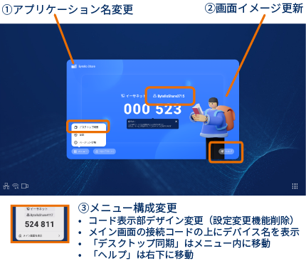- -「画面複製」(デスクトップ同期機能)」は、メニュー内に移動