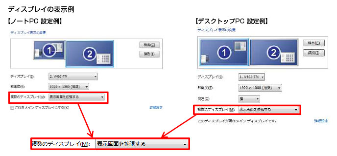 - 設定の為にWindows のコントロールパネル/ディスプレイ/画面の解像度/複数のディスプレイで「表示画面を拡張する」に設定しておく必要があります。