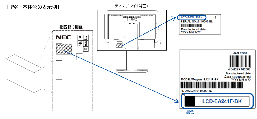 ディスプレイの型名・本体色は、梱包箱やディスプレイ背面に貼り付けされているラベルの以下の部分にて確認できます。